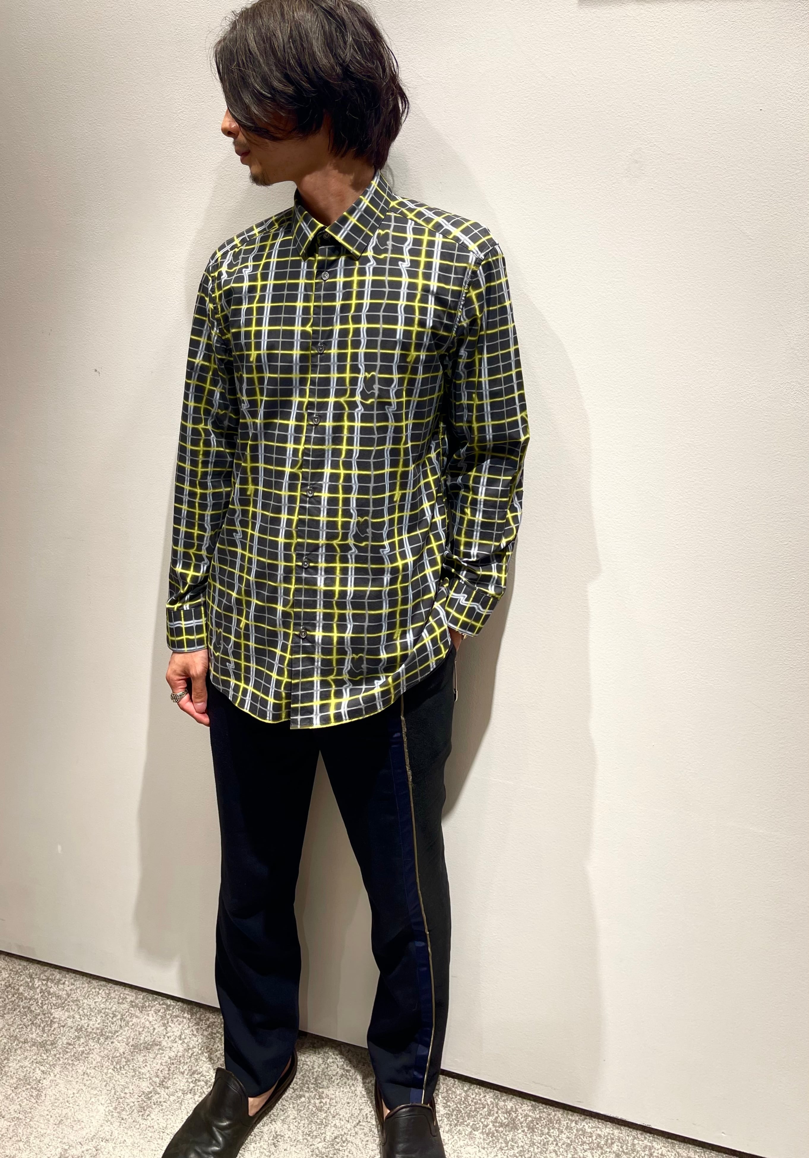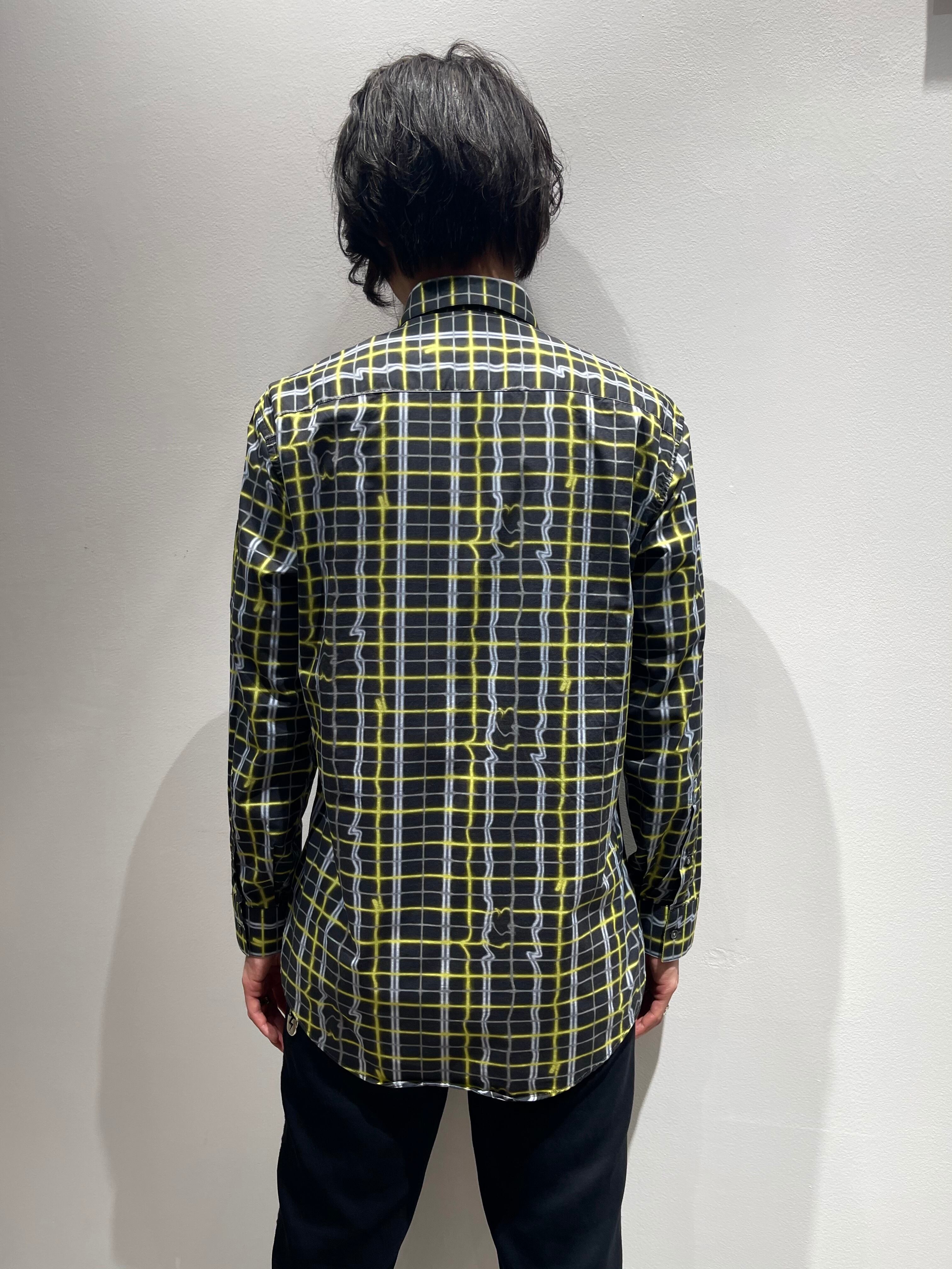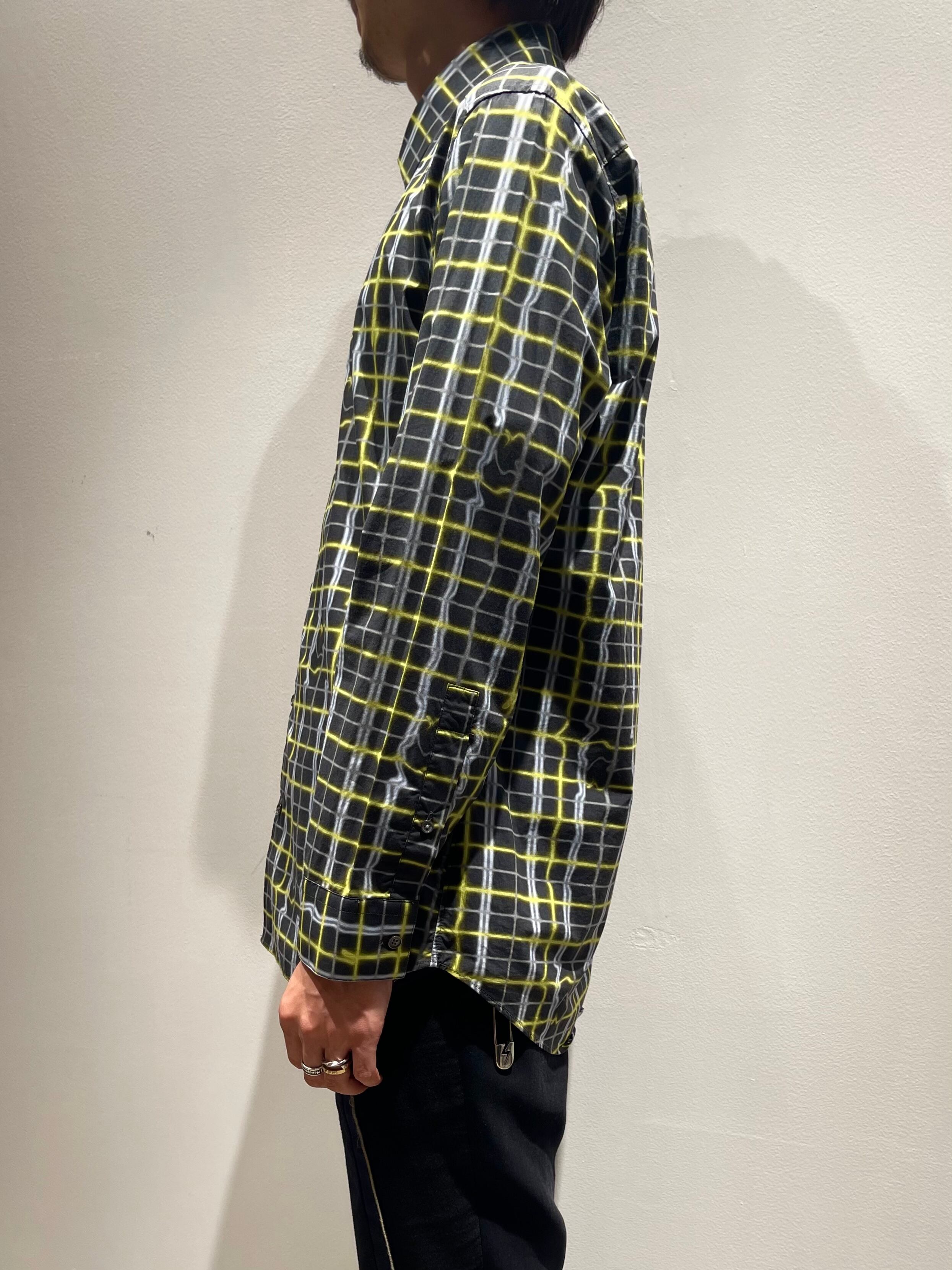 王道なチェックシャツとは違い、ナイロン風なコットンに、曲線が混じったネオン菅風な総柄がユニーク。