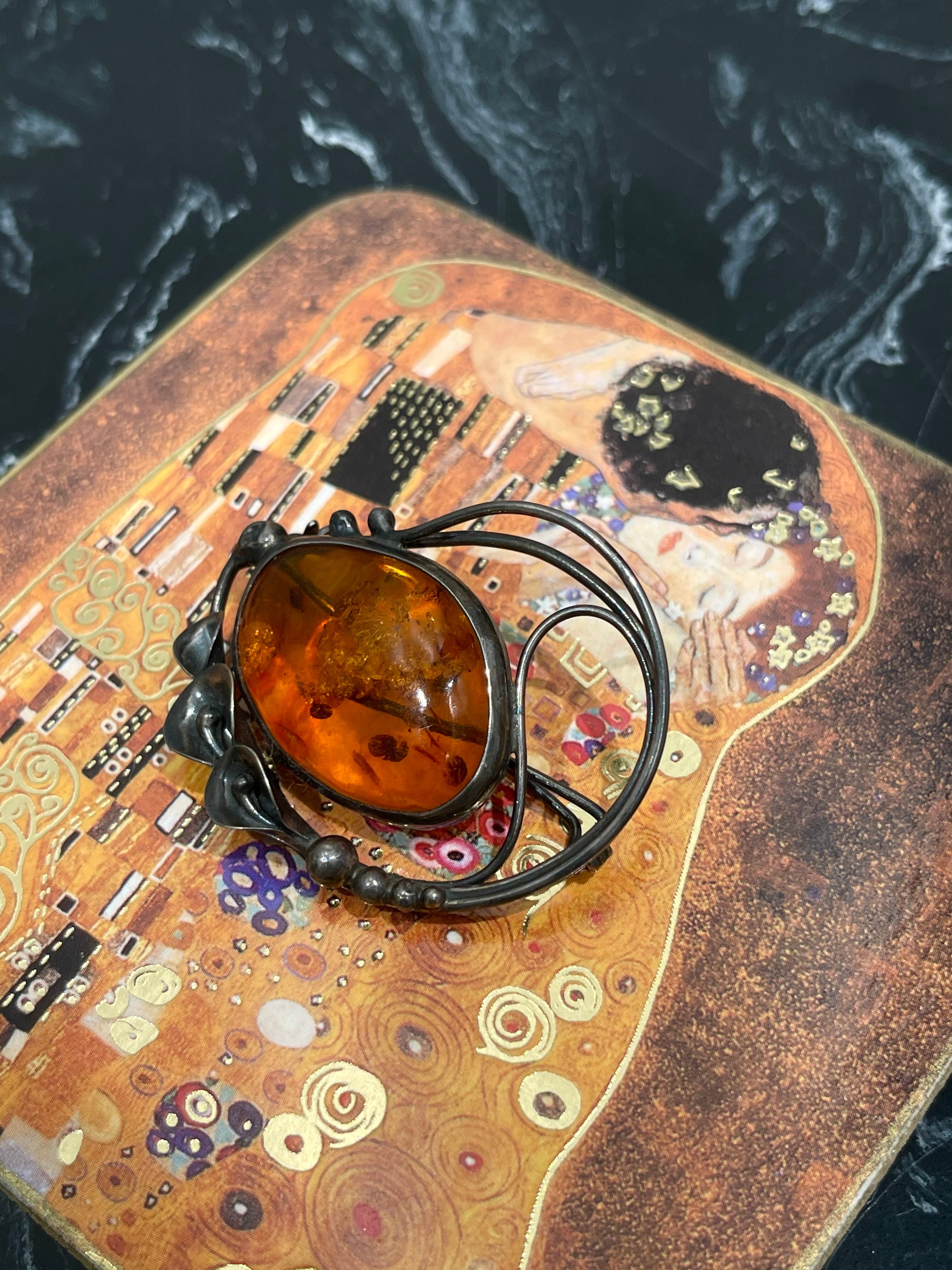 琥珀石のトップにアールヌーヴォーの草木を用いた装飾味のあるヴィンテージシルバーブローチをご紹介。