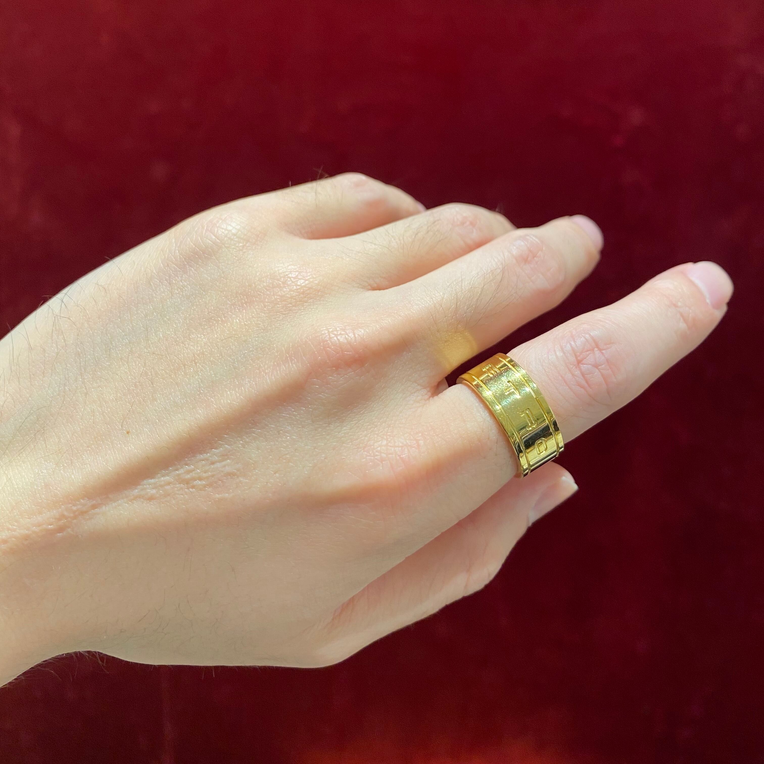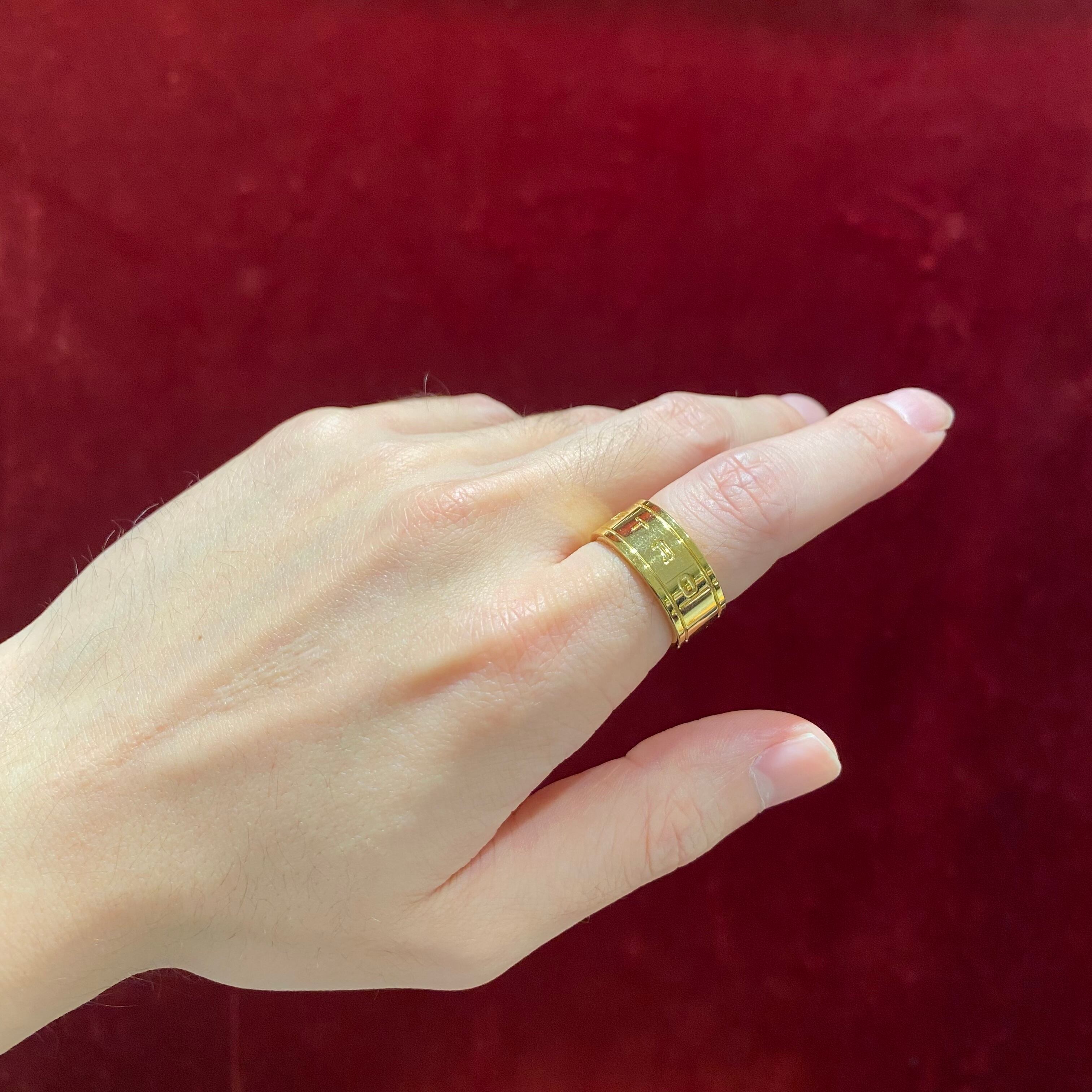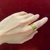 ポリッシュの効いたゴールドコーティングに程良い厚みの存在感のあるリングです。片手に1つだけでも印象抜群。