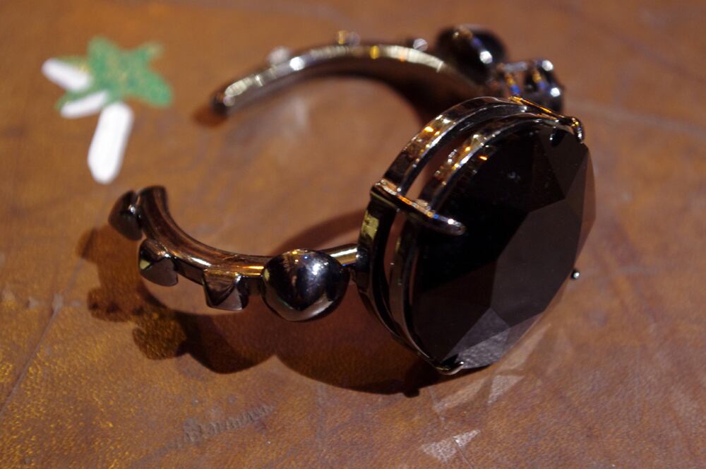 コレクションラインでよく使われる大ぶりな剥き出しのビジューに、華奢なシルバーベルトのアンバランスさが挑戦的でインパクト抜群。