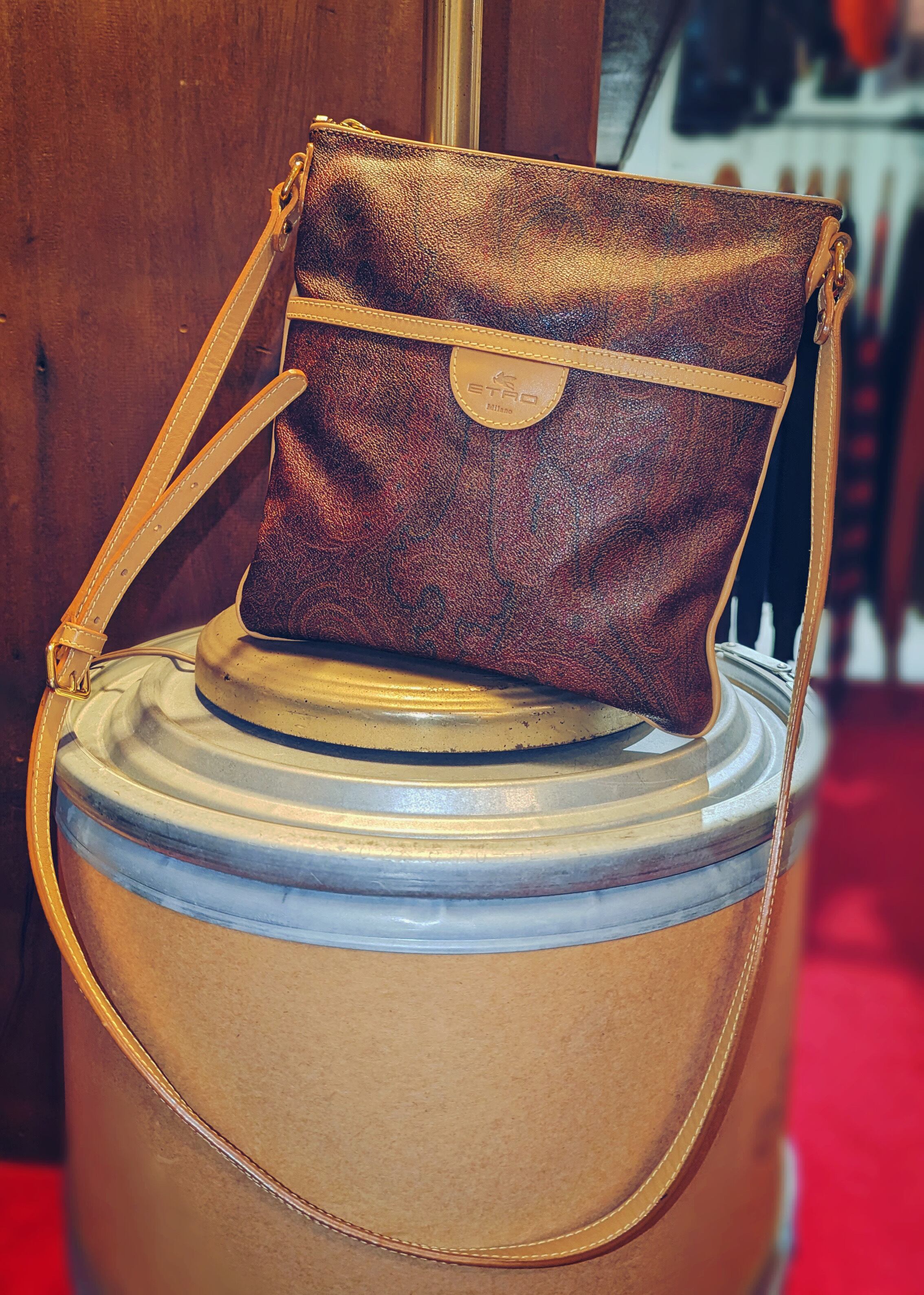 定番のペイズリー柄に、キャメルブラウンの肩紐がエトロらしさを象徴する、ショルダーバッグをご紹介致します。