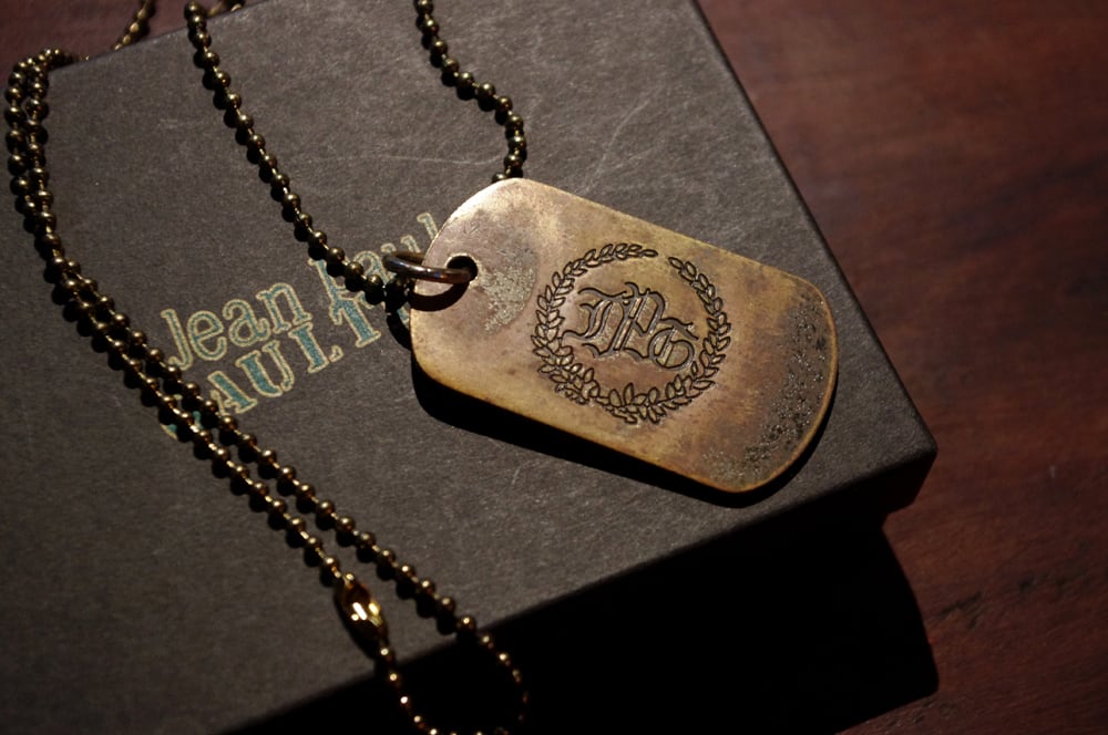 ヴィンテージ感溢れる燻加工の施されたメタルプレートに、ゴルチエのロゴが彫られております。