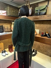深いグリーンに、ノーカラージャケットとカーディガンをミックスした様なスタイリッシュなデザイン。