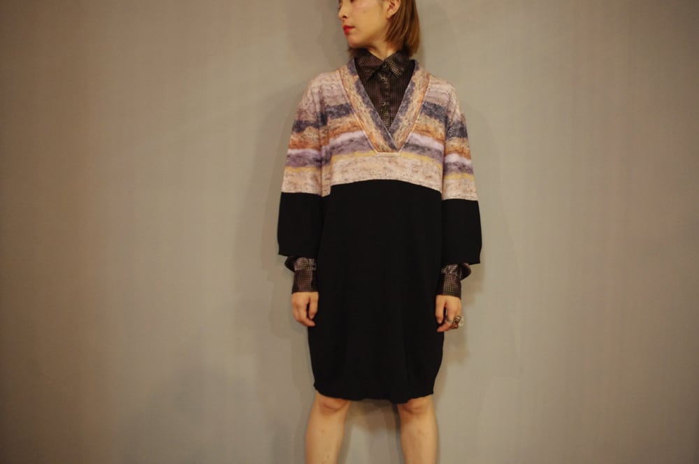 大理石のようなプリントのフェルト地に、肉厚ハイゲージウールの切り替えがユニークなchalayanのワンピース。