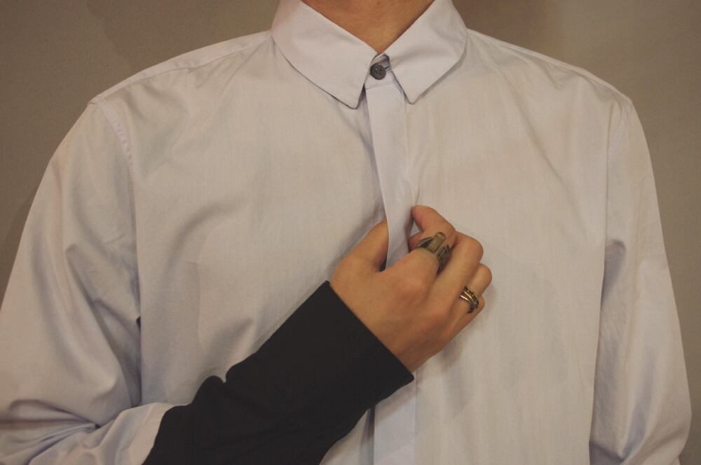スカイブルー×ブラックの袖のカラーミックスがハイセンスなコットンシャツ。
