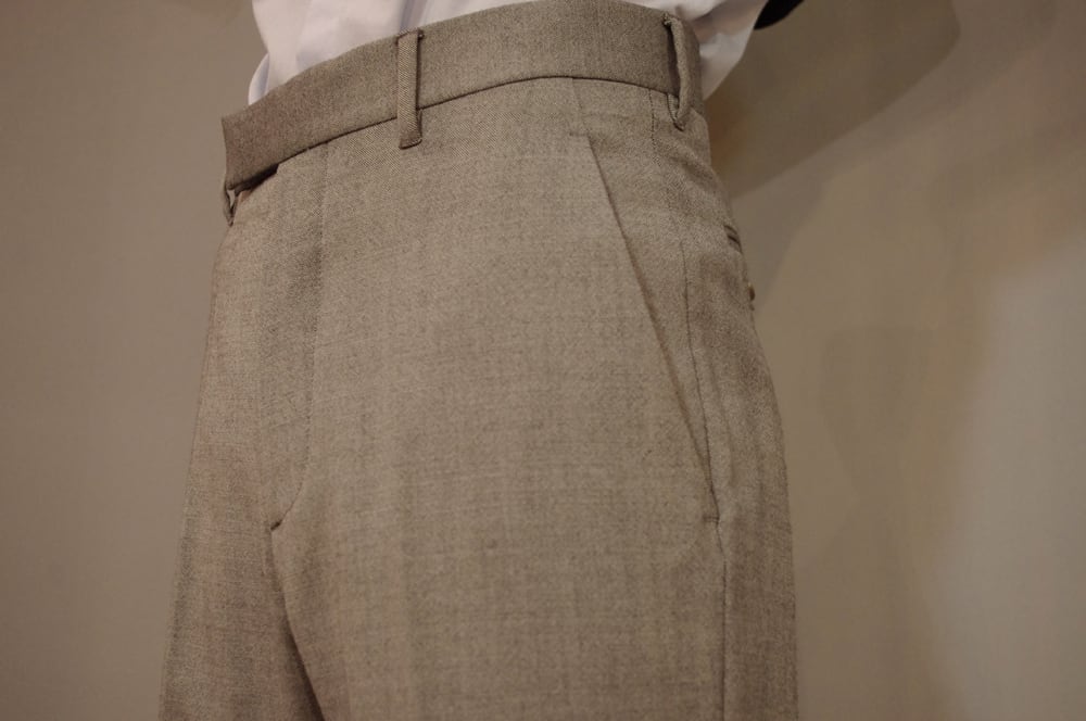 HELMUT LANGでは珍しいゆったりしたパンツ幅に、センタープリーツと質のいいウールがトラッド感溢れるレザーシューズには好相性のこちら。