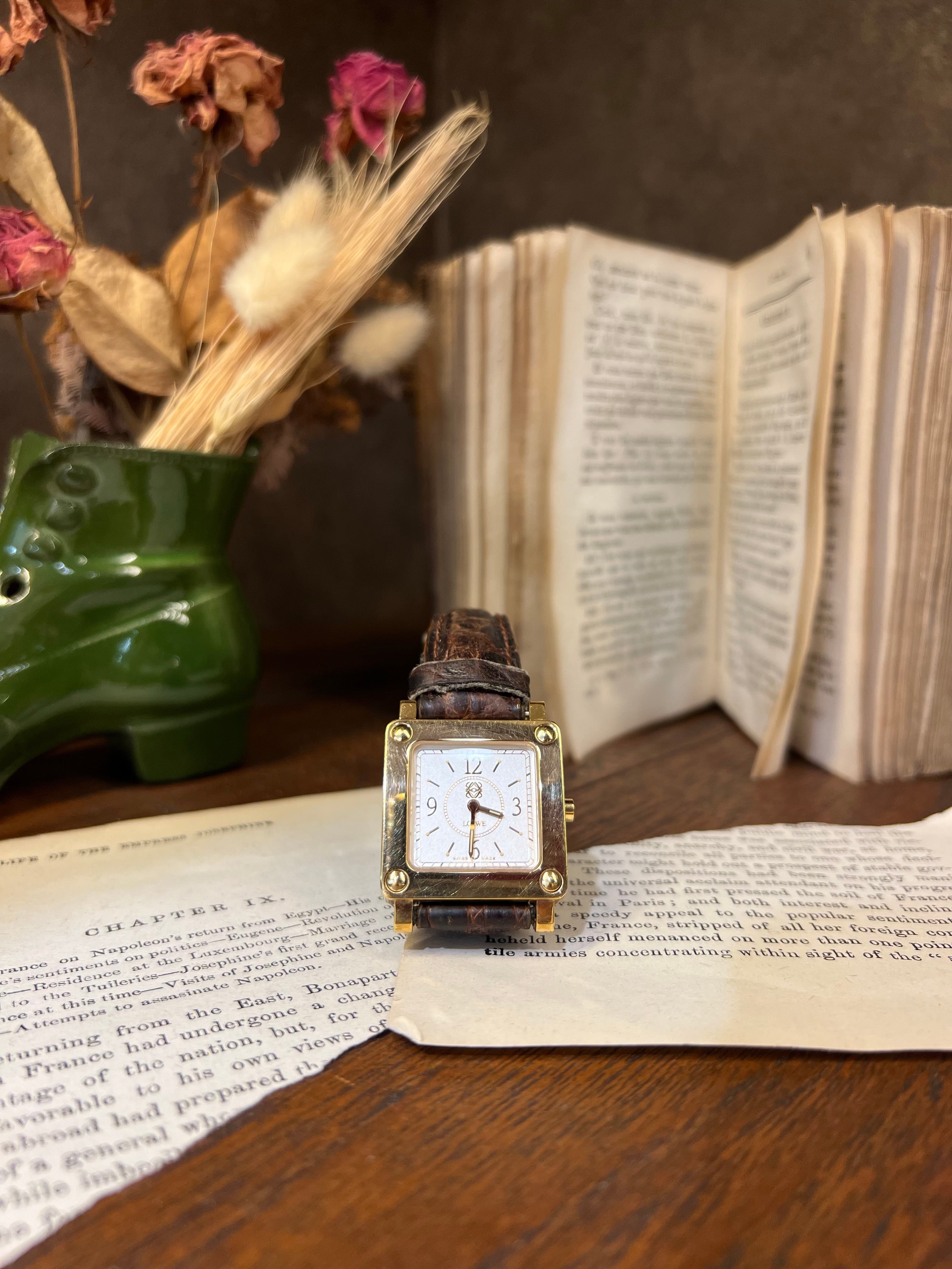 ゴールドのステンレススチールのスクエア型で、側面にも刻印。 インデックスにもロゴがはいっており、気品のあるホワイトとゴールドカラーがクラシックです。