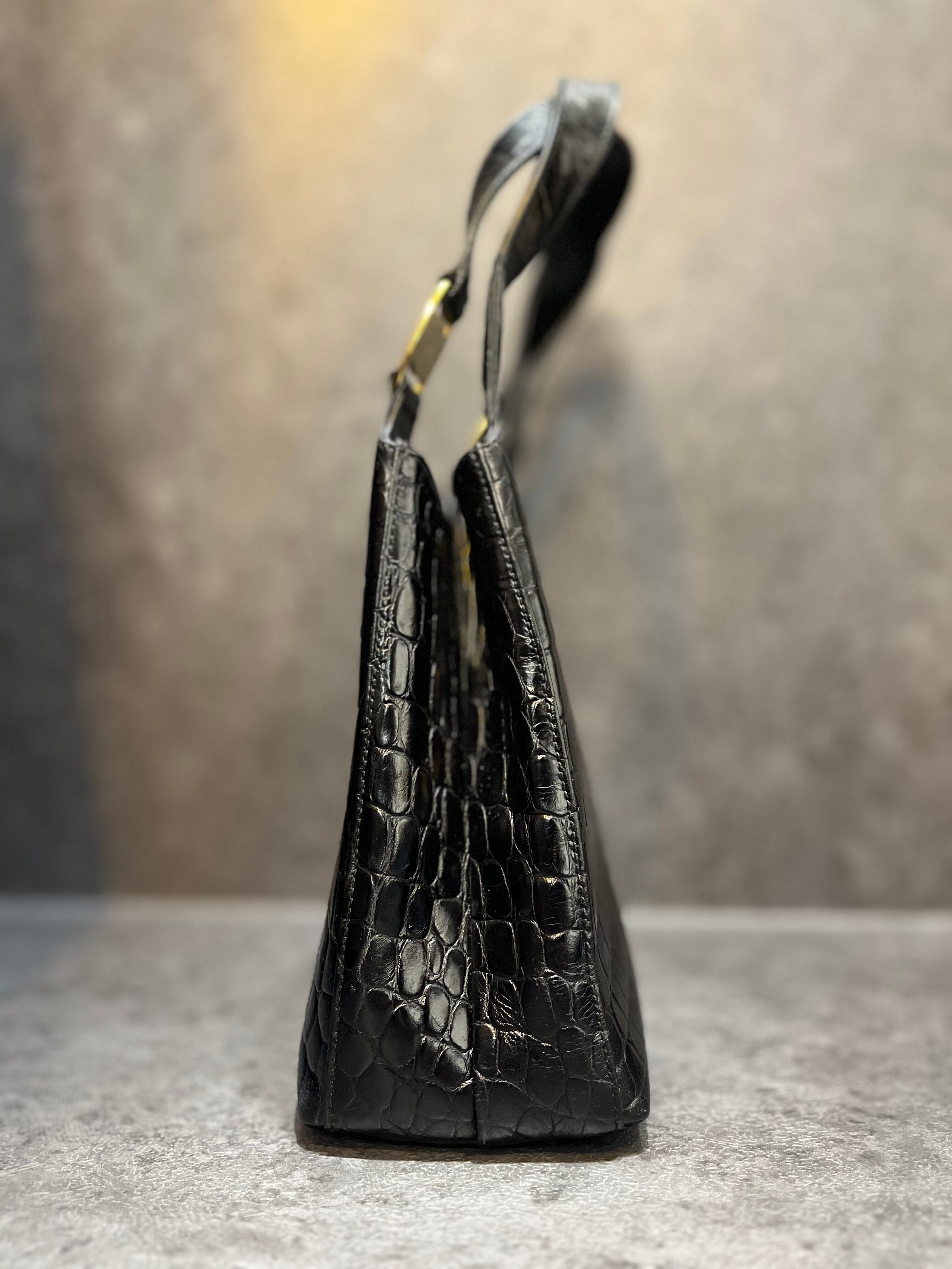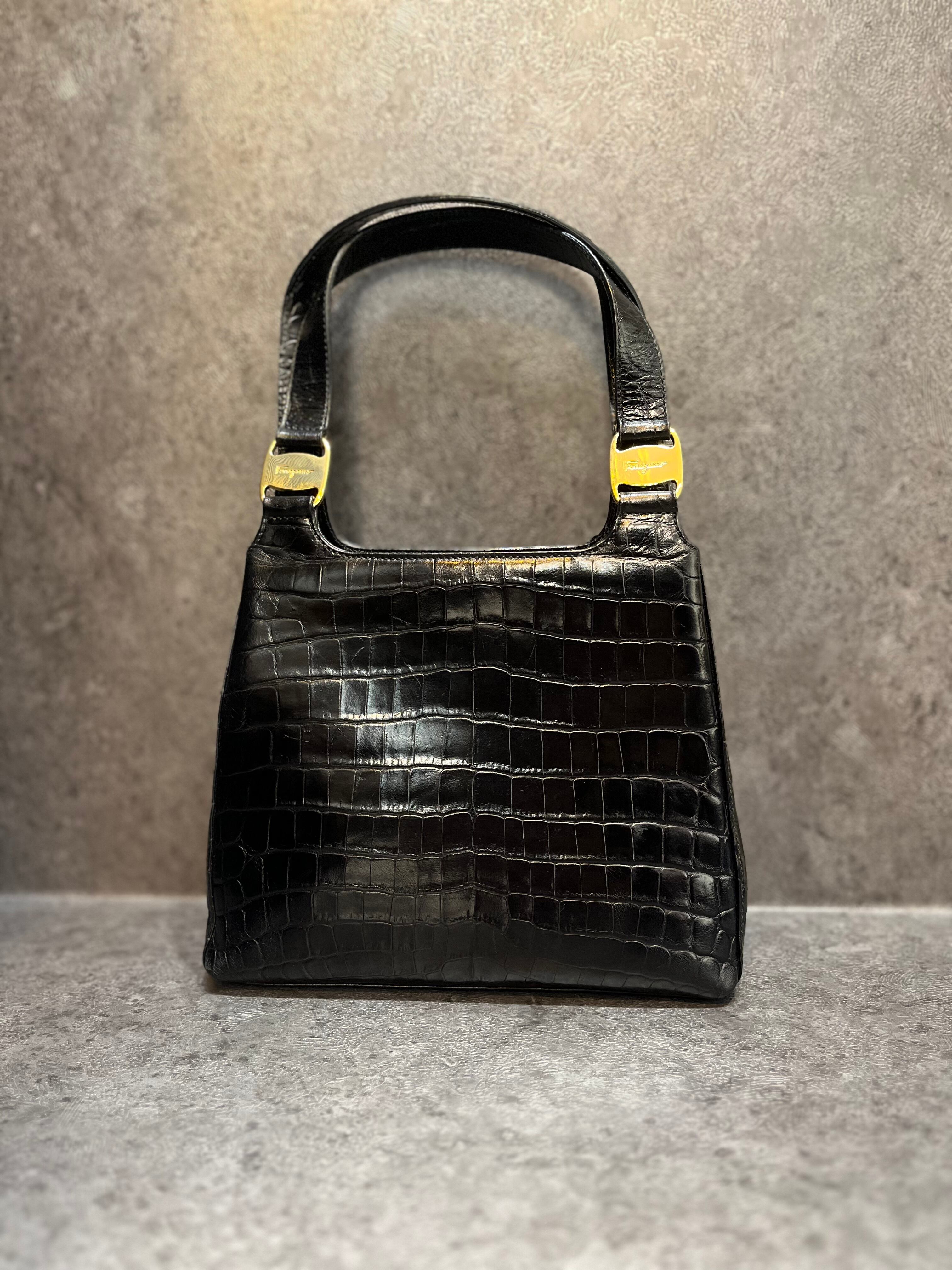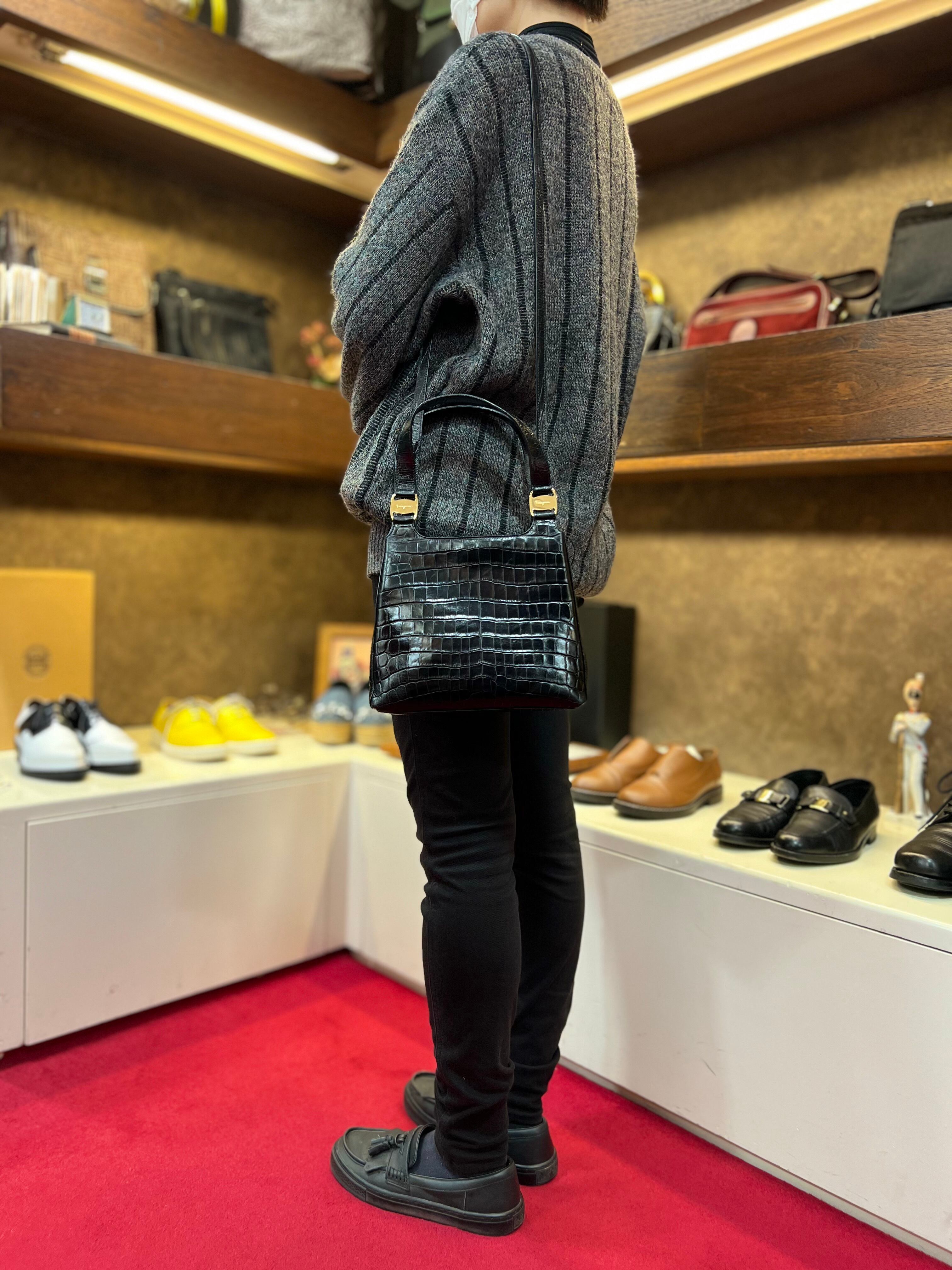 イタリアのラグジュアリーブランド「サルヴァトーレフェラガモ」より、光沢のあるレザーにクロコダイルの型押しが上品なショルダーバッグをご紹介します。