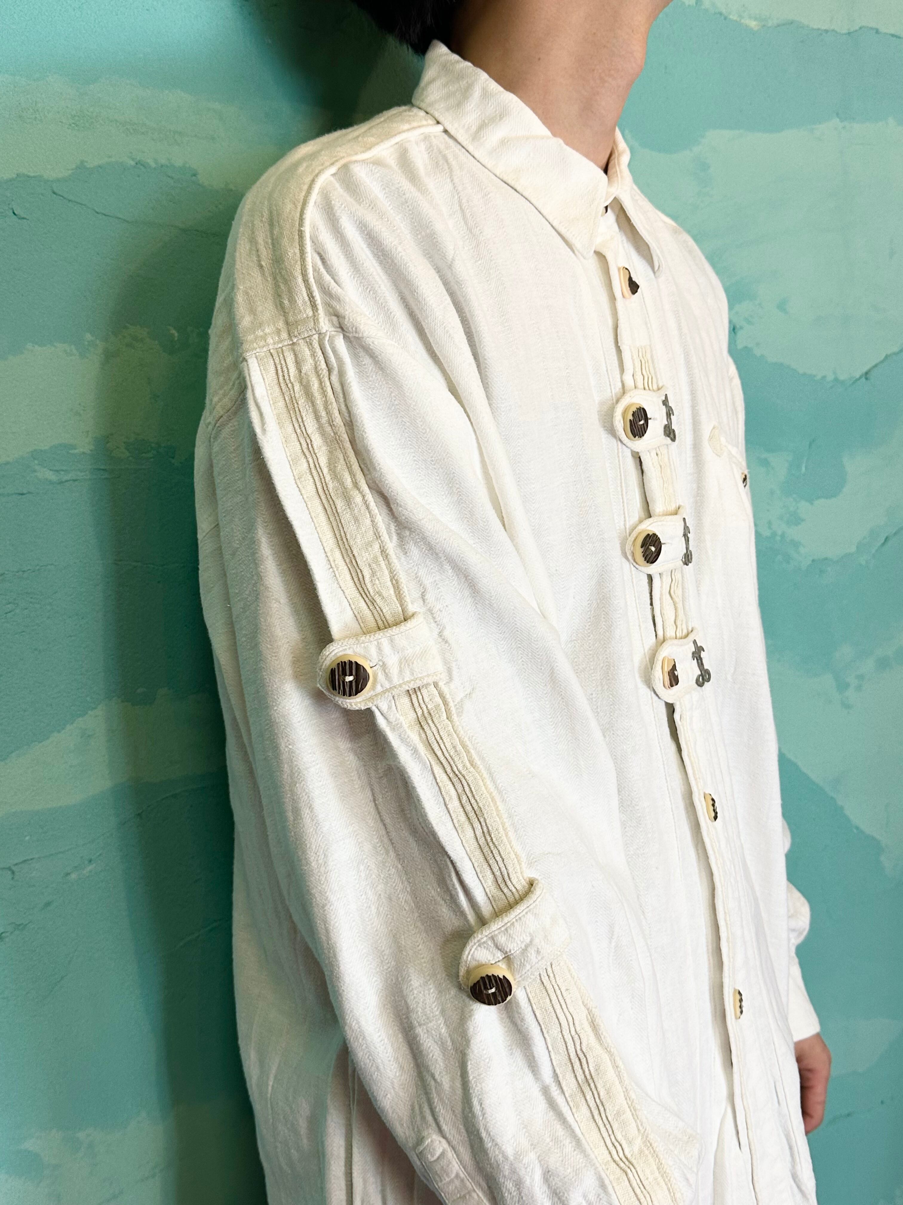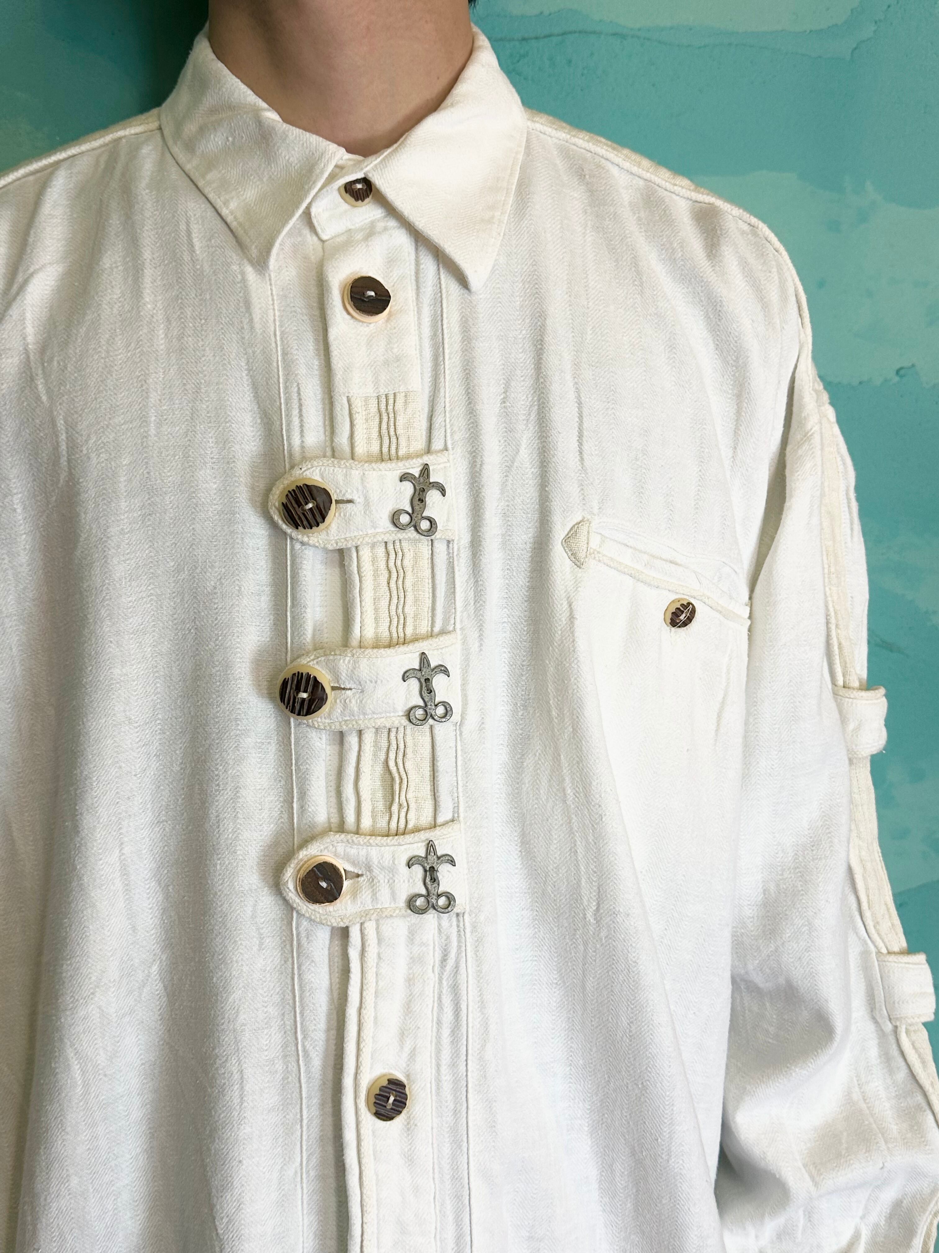 コットンのヴィンテージ感ある風合いに、ベースはオーバーサイズにプリーツとチロルテープに鹿の刺繍。