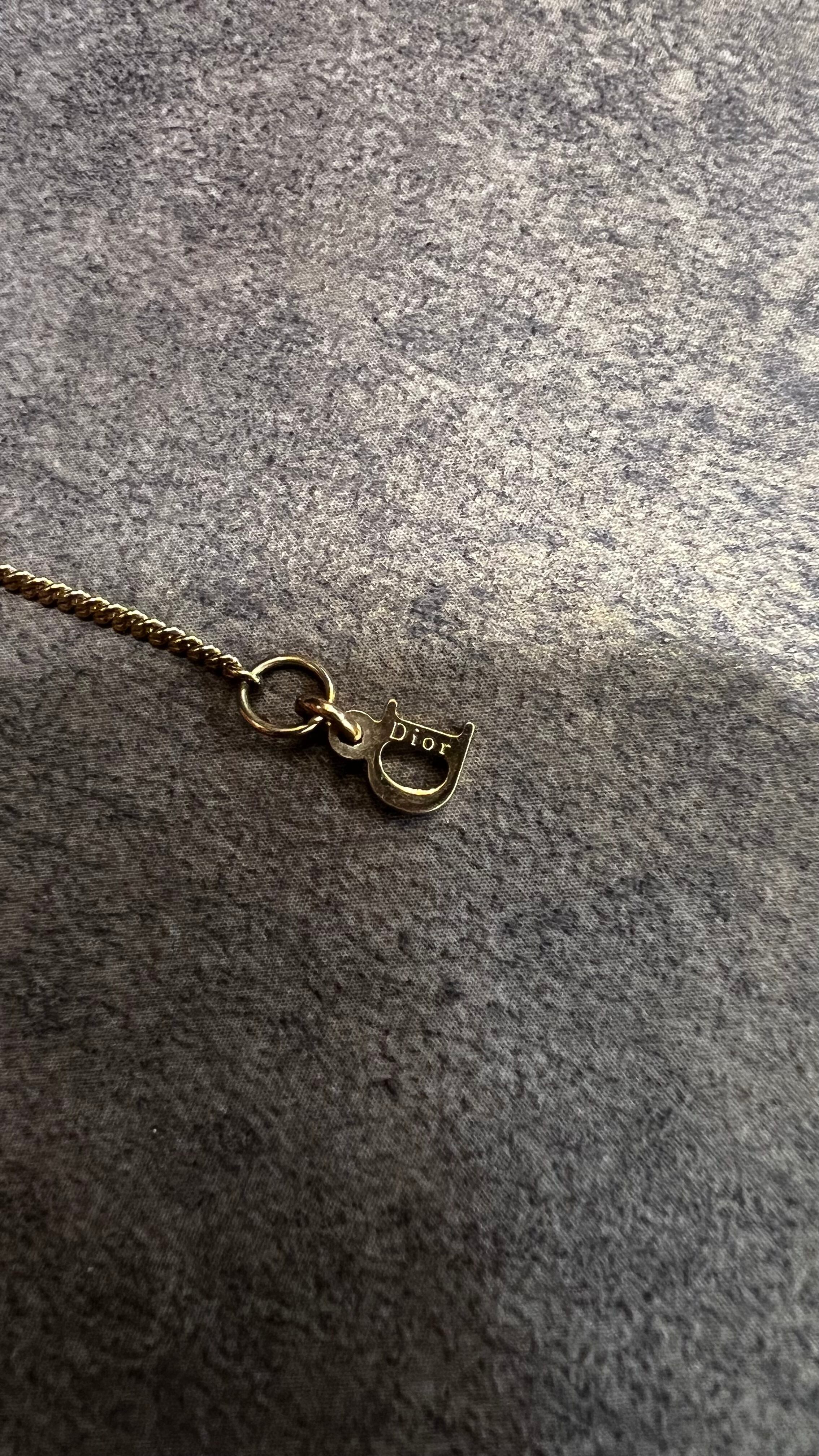 チェーンは細く華奢なサイズ感で、トップのDにはベルトのモチーフとスワロフスキーのラインストーンが。
