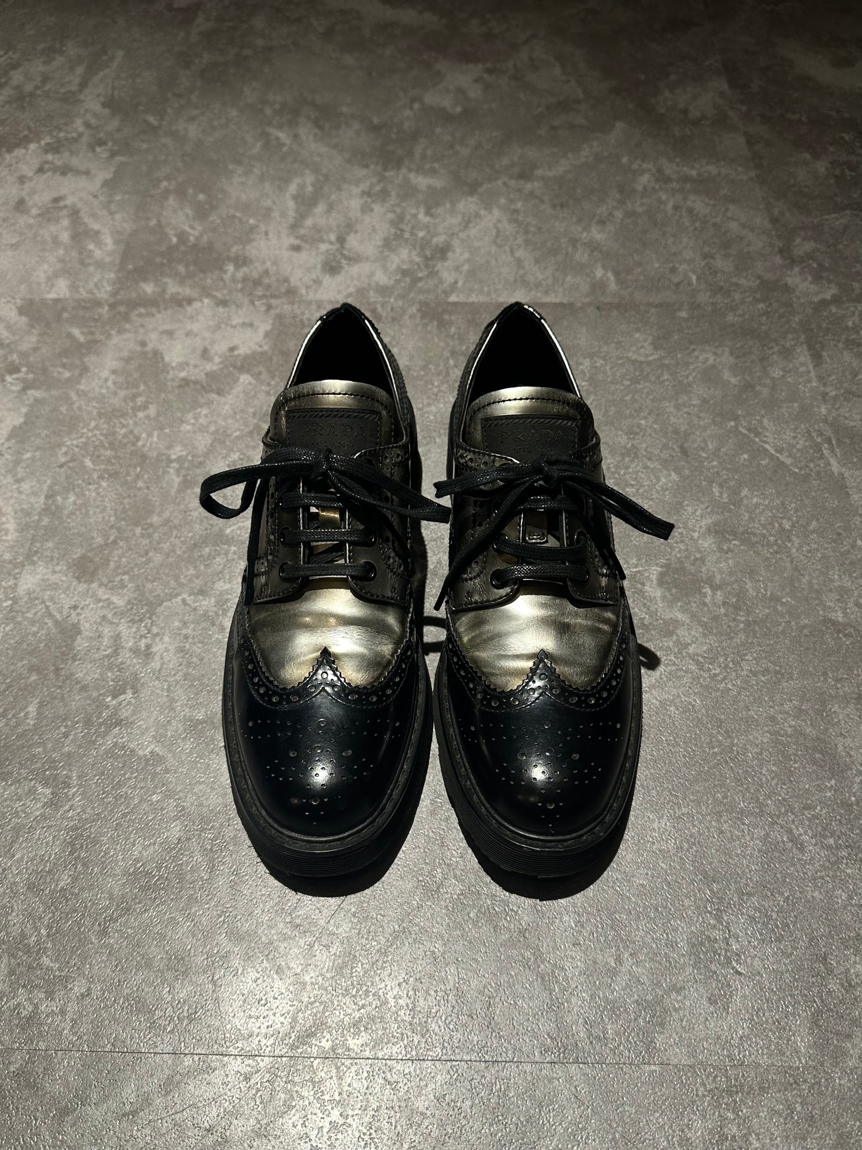 PRADAよりメタリックコーティングのレザーとブラックレザーのバイカラーが目を惹く厚底ソールのコンビネーションシューズをご紹介。