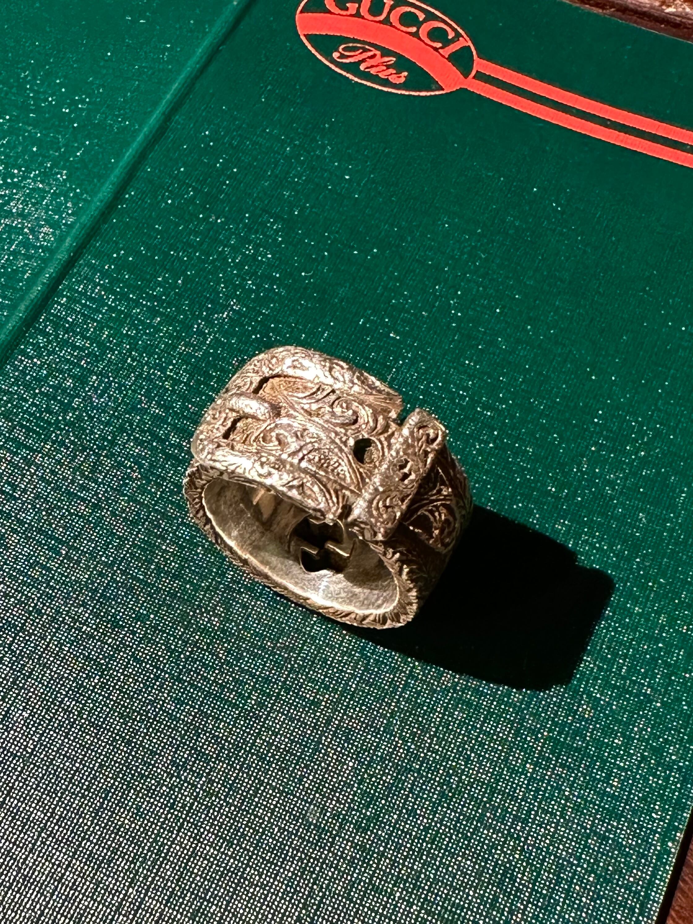 GGのモノグラムに近年デザインの燻加工をミックスした雰囲気のある逸品。