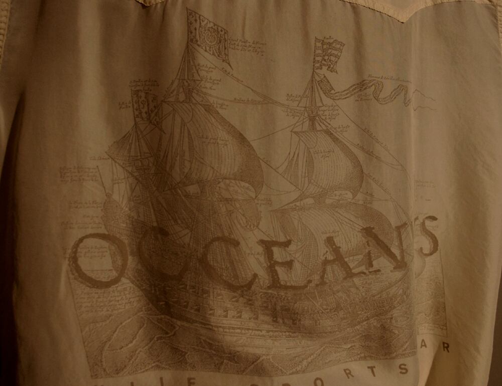 デザインポイントは後ろの大きなプリントで、繊細なタッチで描いたような大きな帆を張る船は躍動感があり壮大なスケール。古い地図のように影の部分にも表情を感じられるアートのよう。