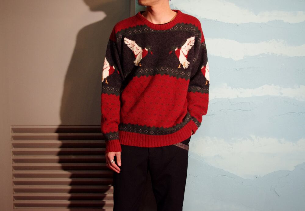 キュートなカモが羽ばたく様子が編み込まれたFRANCE vintageのニットセーター。