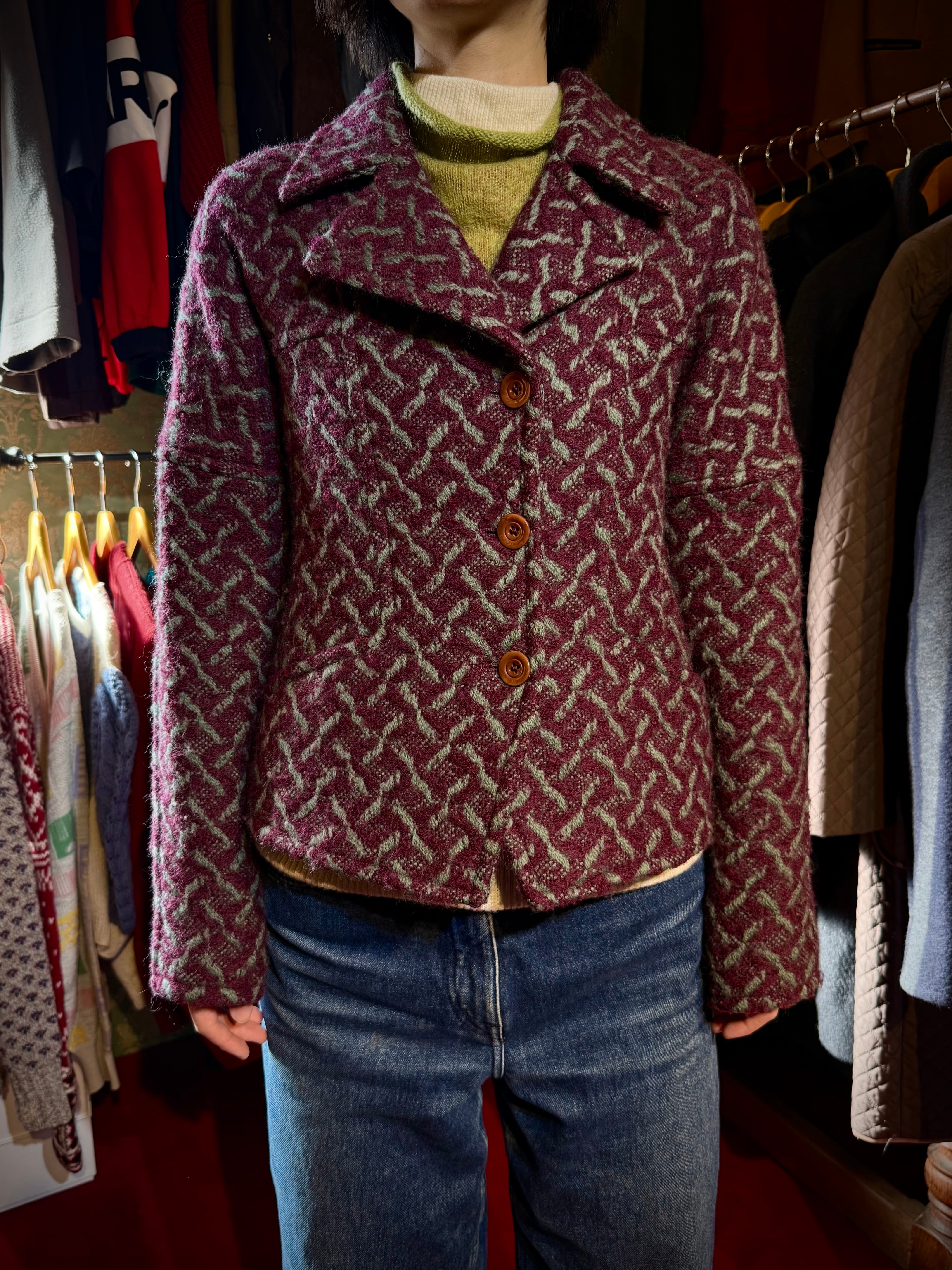 本作もまた、そんなドリスらしさが存分に感じられる一着。バーガンディ × グレーの絶妙な色彩バランスが美しく映える上質なツイードウールは、暖かみと深みを併せ持ち、繊細な織りのニュアンスが独自の世界観を生み出します。