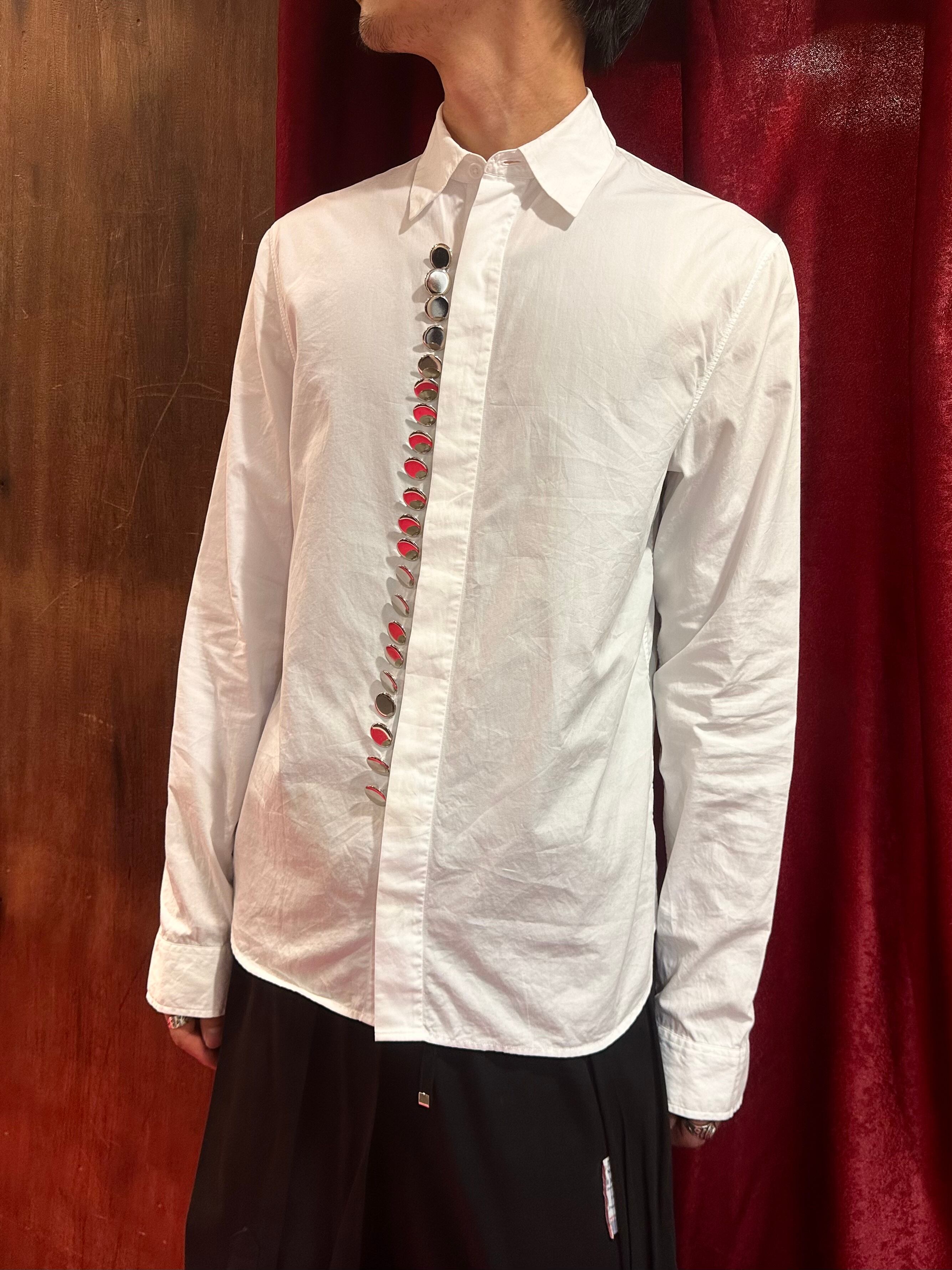 綺麗目でシンプルなコットンポプリンシャツに、光沢のあるボタンが並び、イレギュラーかつユーモアのあるディレクションが愉快なJ.W.Aらしい1着に。