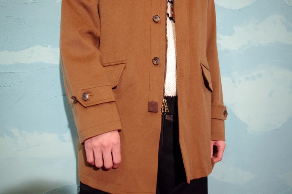 キャメルブラウンで三角襟のジャケット型とクリーンなニュアンスですが、軽量で程よい緩さのある身幅がリラックス感のある作り。
