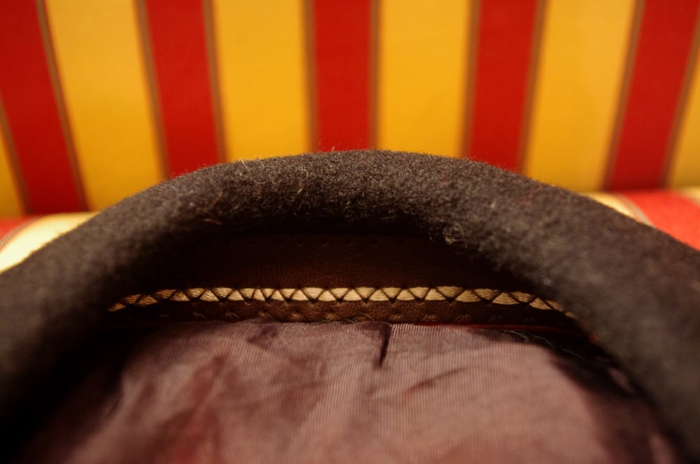 一見よくある定番のベレーに見えますが、裏面をみると縁に約2cmのレザーが張られていて形状記憶・型崩れを防ぐ役目を果たしています。