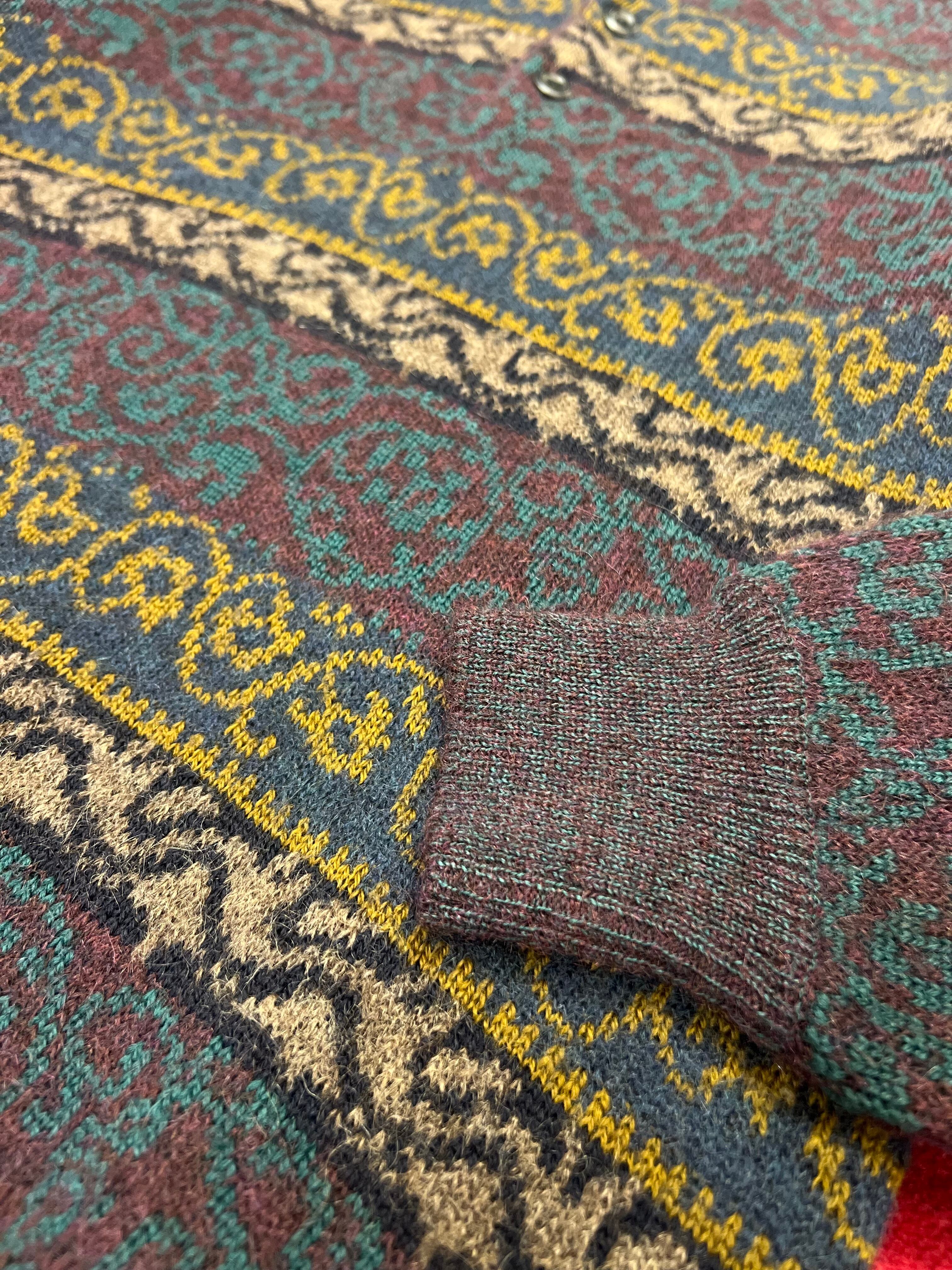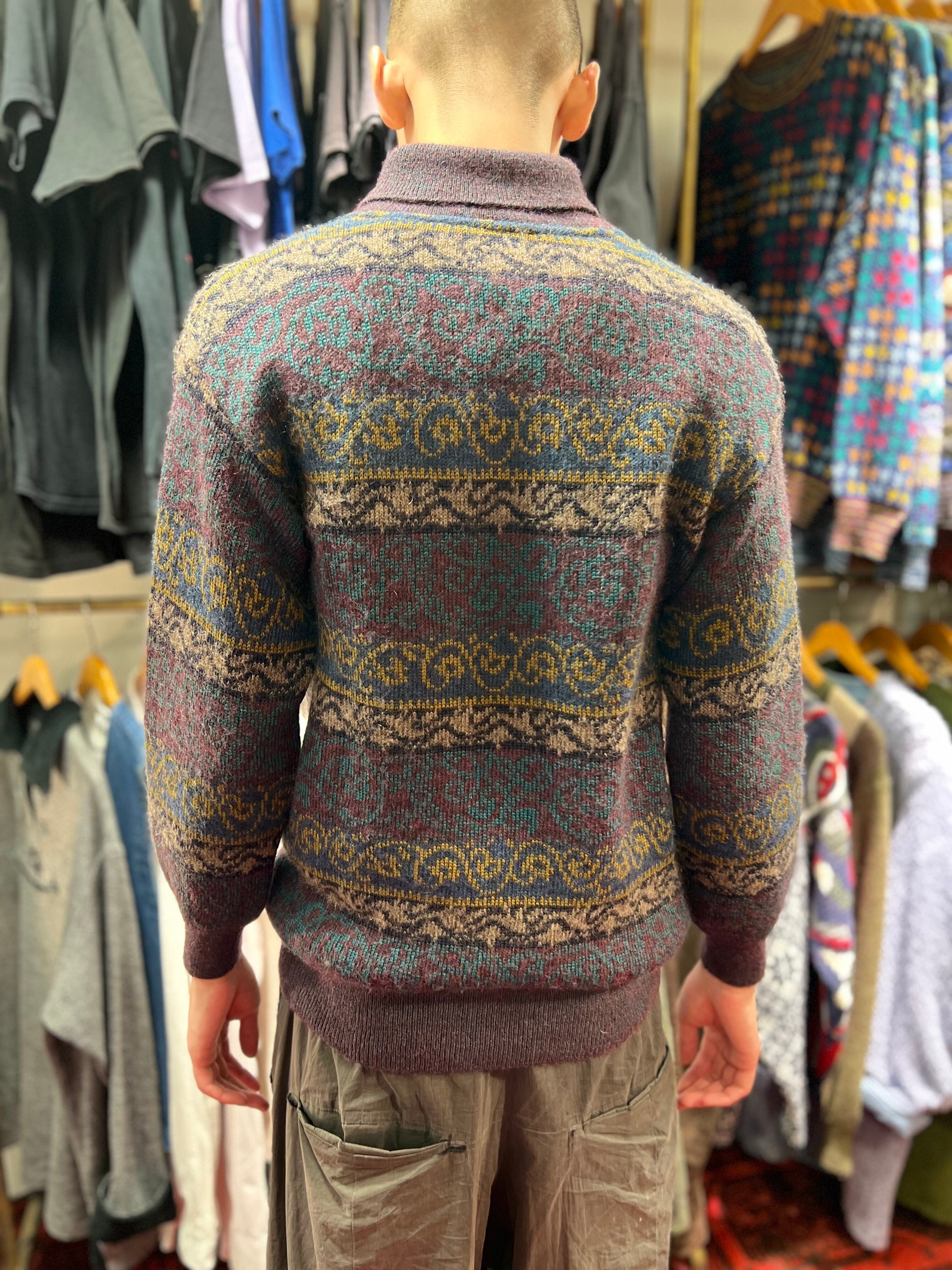 襟のついたニットなので、中にシャツやタートルネックを入れると印象も変わり、様々な組み合わせでお楽しみいただけます。